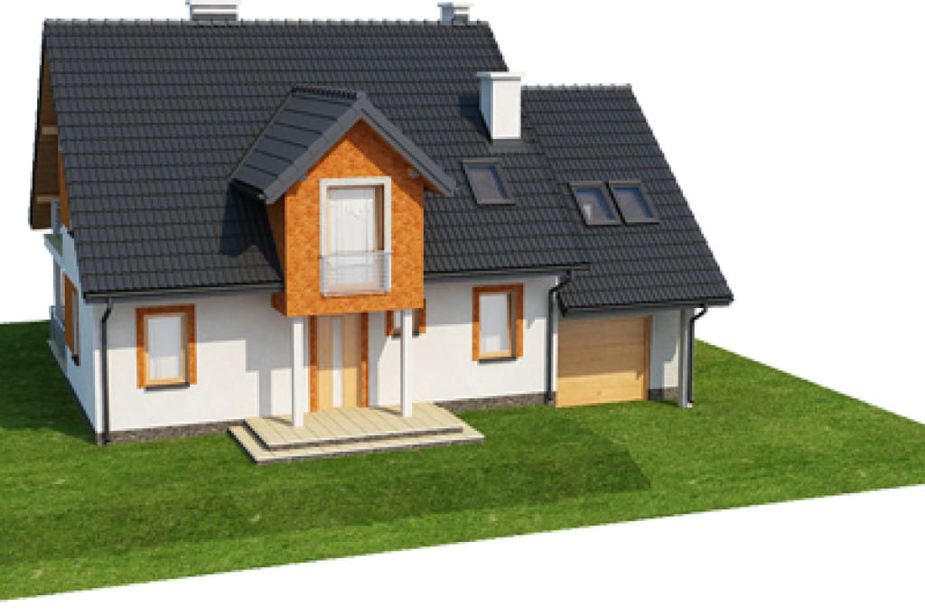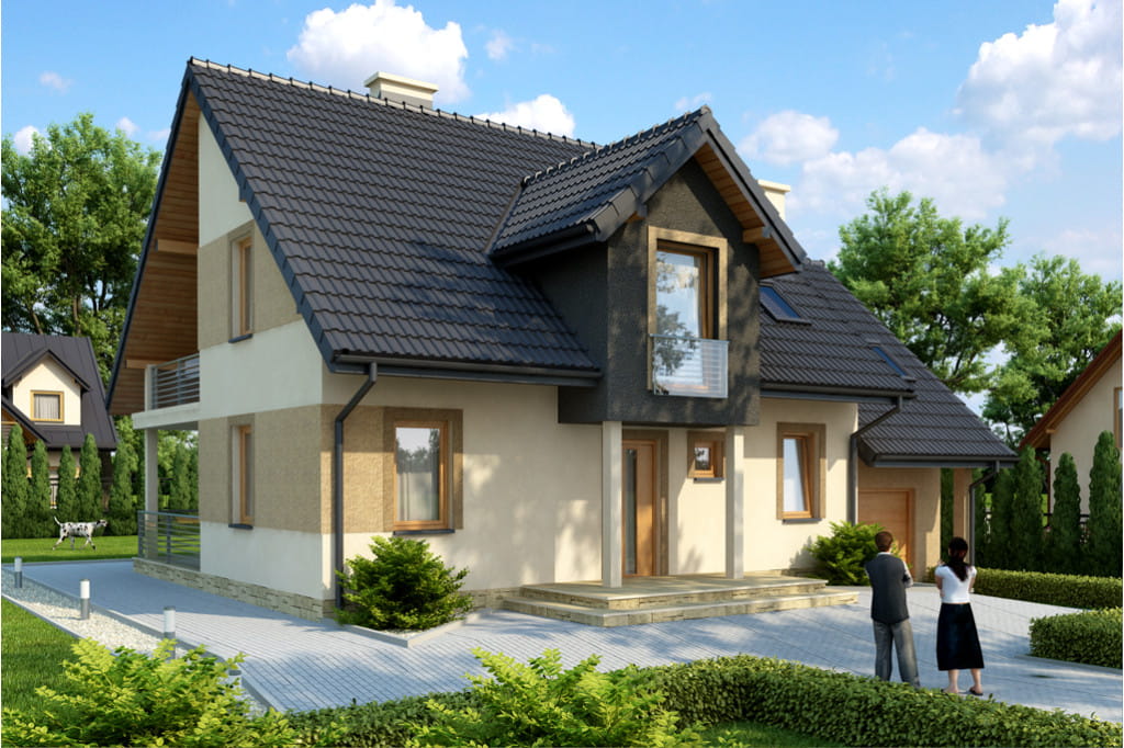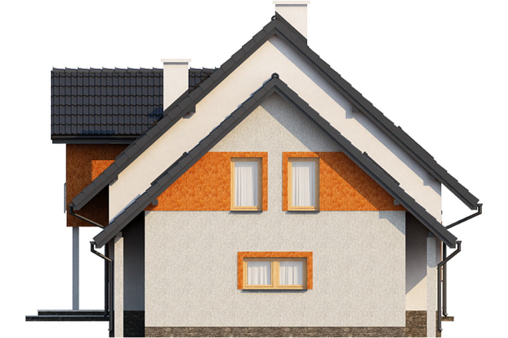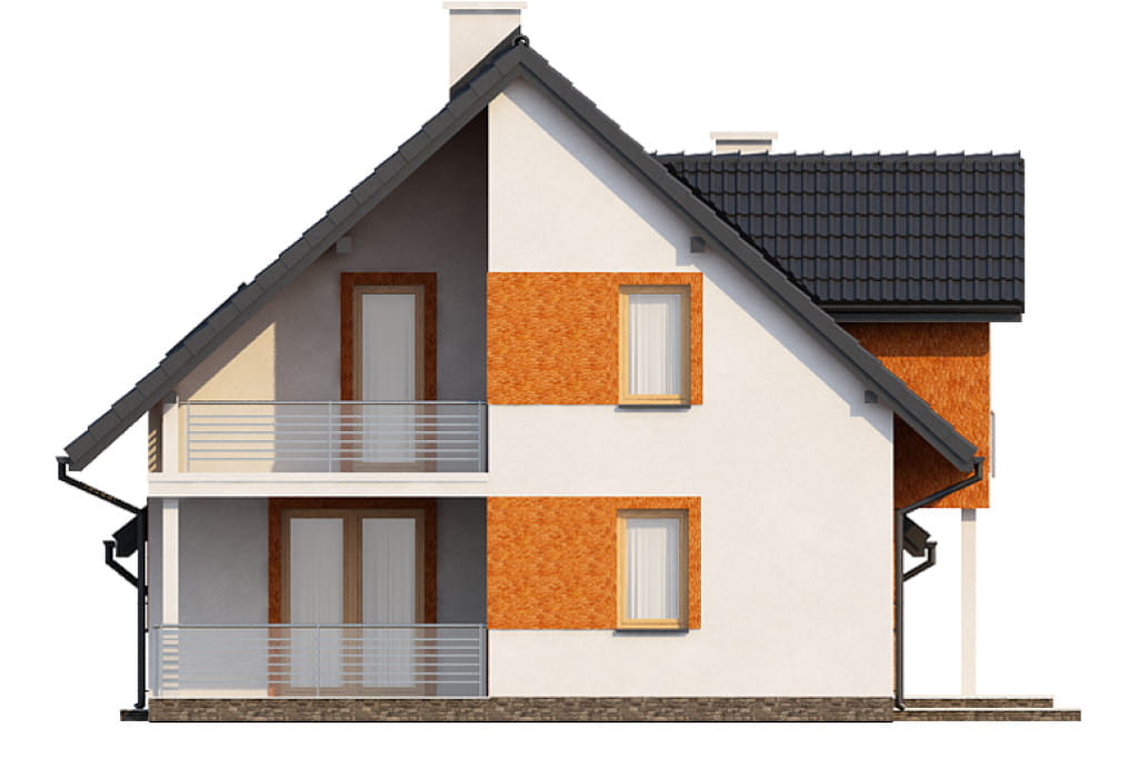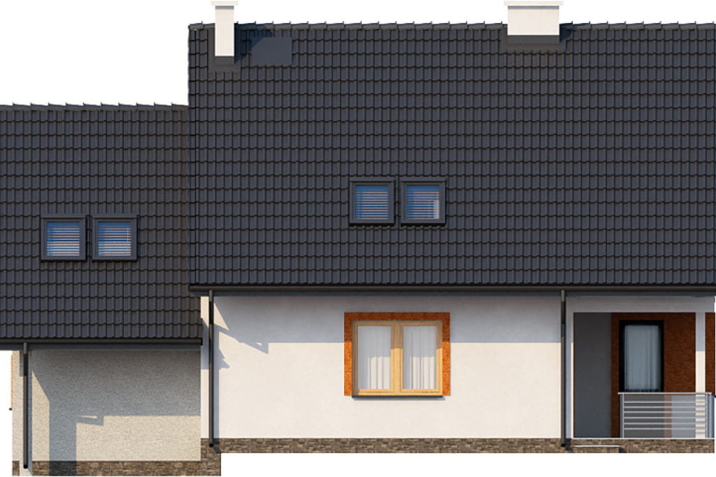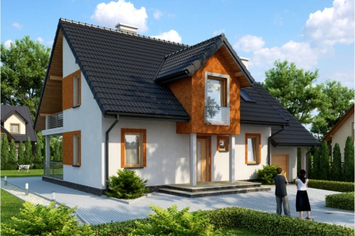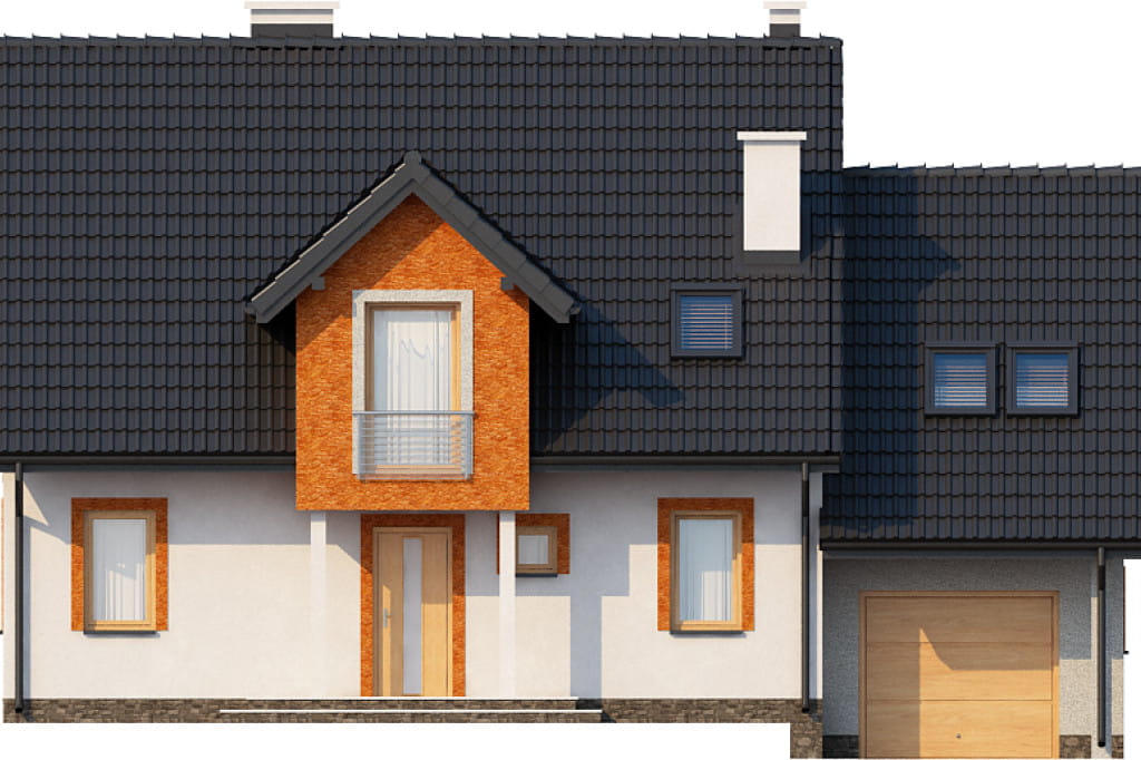 Projekt składa się z połączonych brył domu i garażu, obie przykryte są dwuspadowym dachem. W elewacji frontowej znajduje się wysunięta lukarna, którą wspierają dwie kolumny. Tworzy ona tym samym zadaszenie dla głównego wejścia do budynku. Interesująco przedstawia się także elewacja boczna z zadaszonym balkonem i małym tarasem.