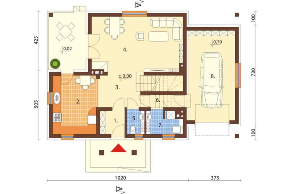Na parterze znajduje się garaż jednostanowiskowy z dodatkowym wejściem z wnętrza domu. Dzięki niemu można łatwo i szybko dostać się do samochodu, bez potrzeby wychodzenia na zewnątrz. Duża otwarta kuchnia ma osobne wyjście na taras, więc w słoneczne dni można podać posiłki na zewnątrz. Przestronny pokój dzienny wyposażyliśmy w kominek, oraz wyjście na taras. Kotłownia oraz WC znajdują się na prawo od wiatrołapu.