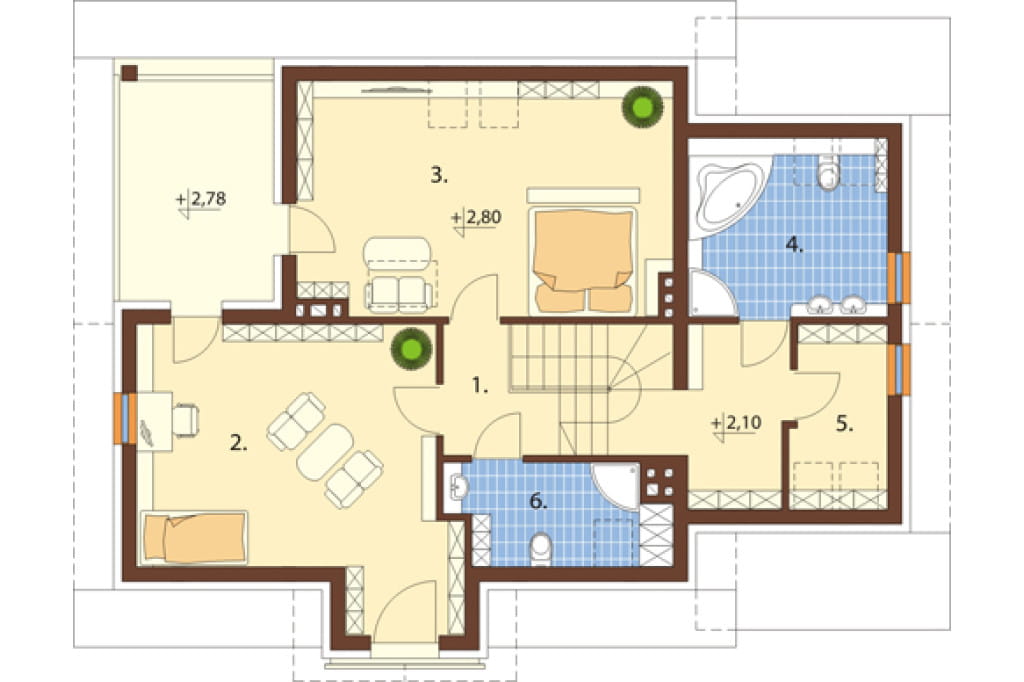 Na poddaszu użytkownicy będą mieli do dyspozycji aż dwie łazienki, co na pewno wpłynie na większy komfort użytkowania. Dostępne pokoje są bardzo przestronne, oba mają ponad 20 metrów kwadratowych powierzchni użytkowej. Pozostałą powierzchnię zaadaptowaliśmy pod garderobę.