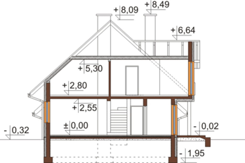 Technologia tradycyjna. Ściany zewnętrzne: pustak POROTHERM 25 cm, styropian 15 cm, tynk zewnętrzny. Stropy: żelbetowe. Program: 2 pokoje, salon, kuchnia, 2 łazienki, wc, garderoba, kotłownia, garaż. Kąt nachylenia dachu 42°