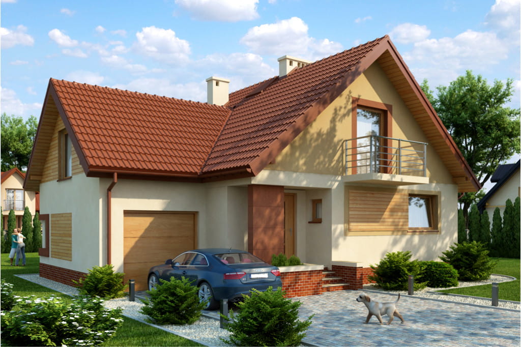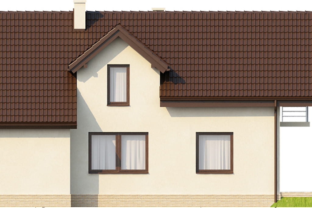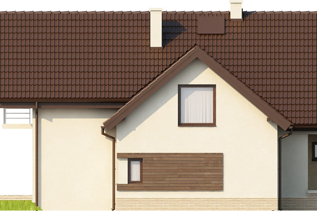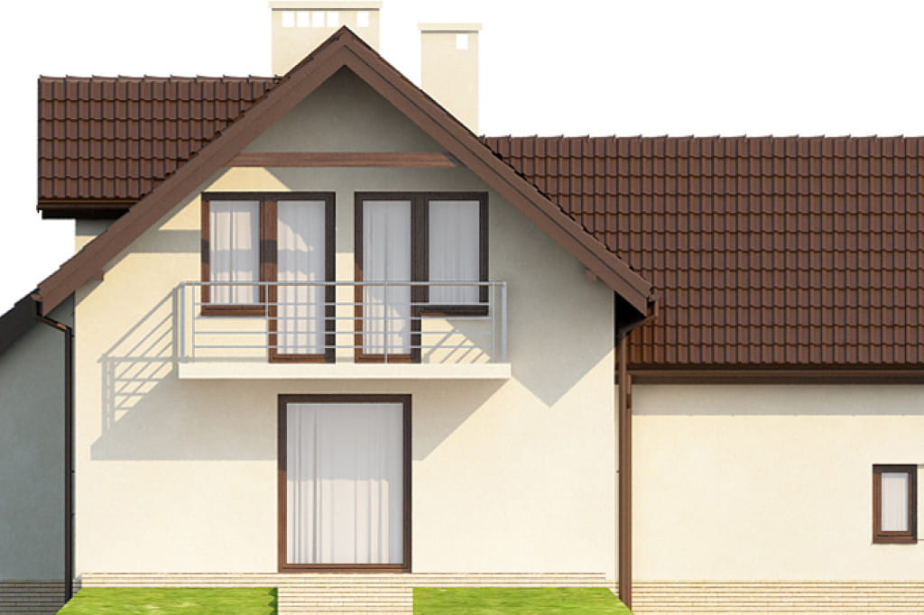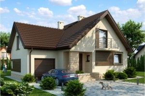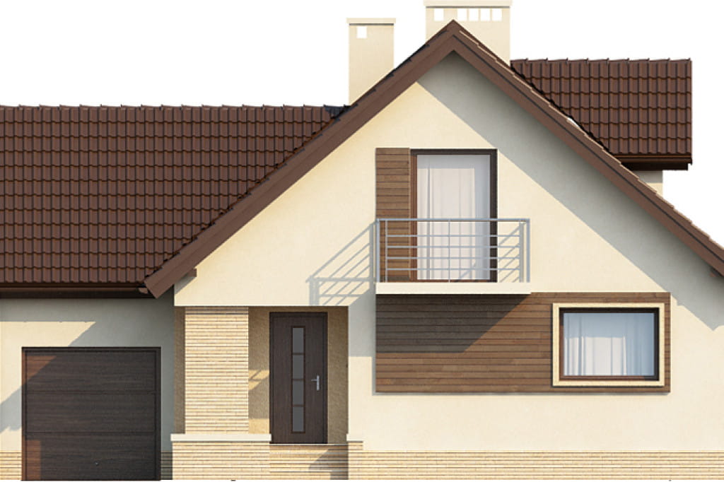 Bryła budynku posiada dobudowany z boku garaż, którego połać dachowa położona jest poprzecznie w stosunku dwuspadowej połaci dachu domu. W elewacji bocznej od strony kuchni znajduje się małe wysunięcie, które powiększa jej powierzchnię użytkową. Dom posiada dwa balkony, jeden mały w elewacji frontowej oraz drugi większy w elewacji ogrodowej. Projekt doskonały do realizacji na średniej wielkości działkach.
