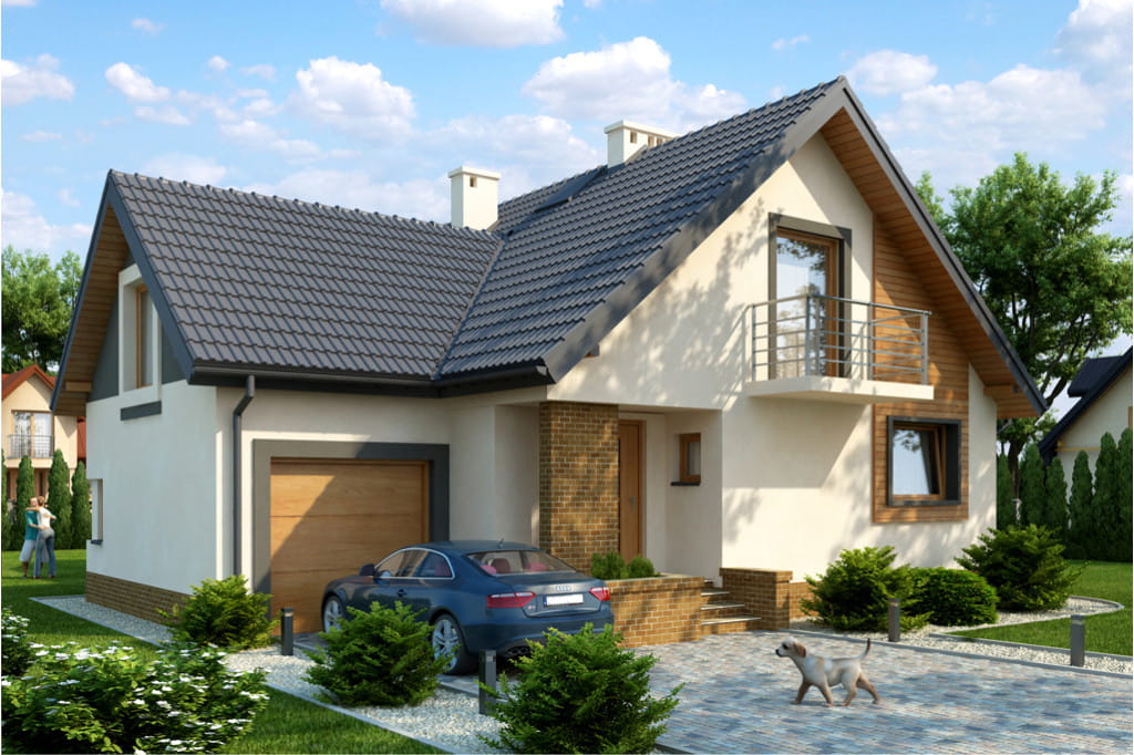Projekt domu L-6380. Dom parterowy z poddaszem mieszkalnym, bez podpiwniczenia, z garażem.