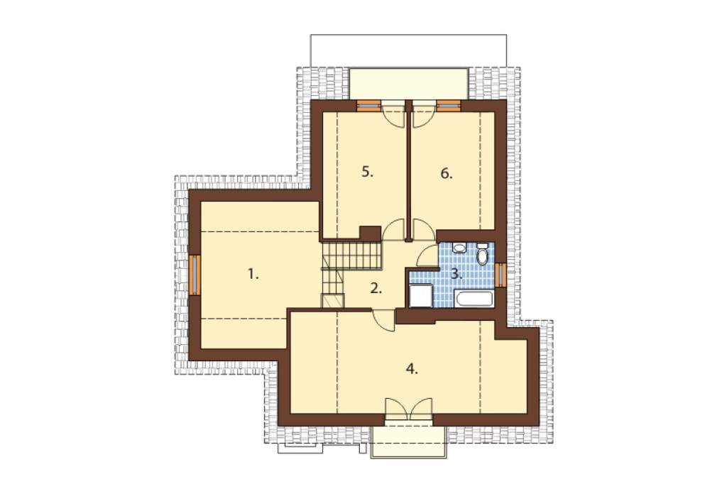 Na poddaszu znajdują się trzy pokoje, każdy z nich posiada wyjście na balkon. Dodatkowo nad garażem zaprojektowaliśmy pomieszczenie, które może służyć domownikom jako biblioteka. Wspólna dla domu łazienka znajduje się na wprost schodów.