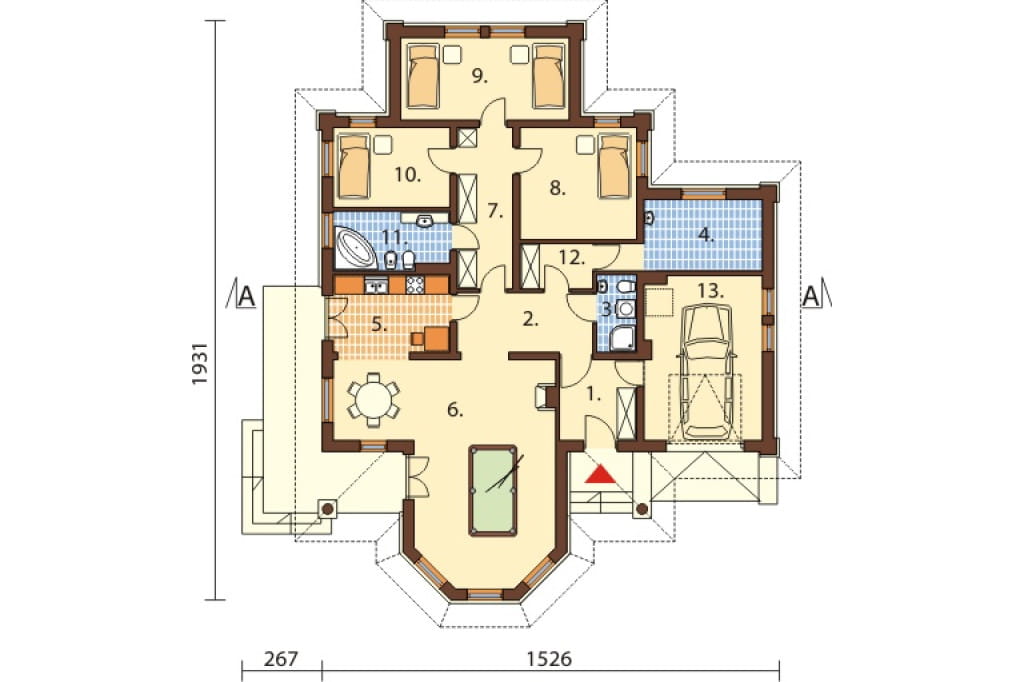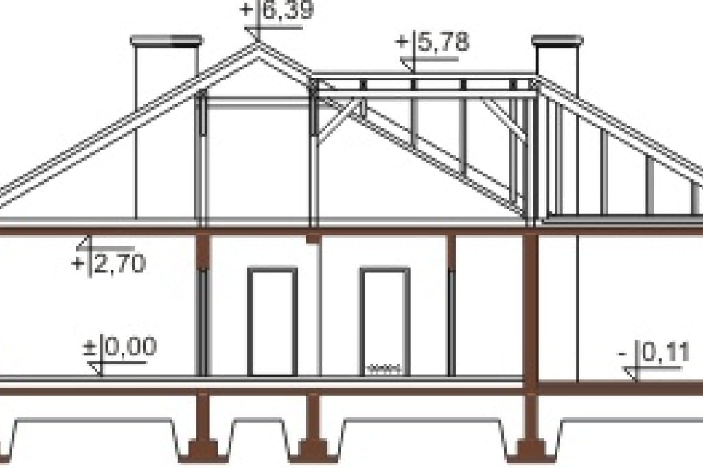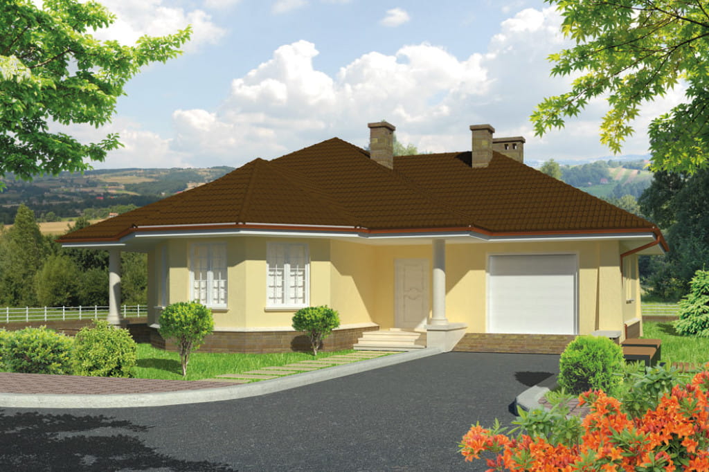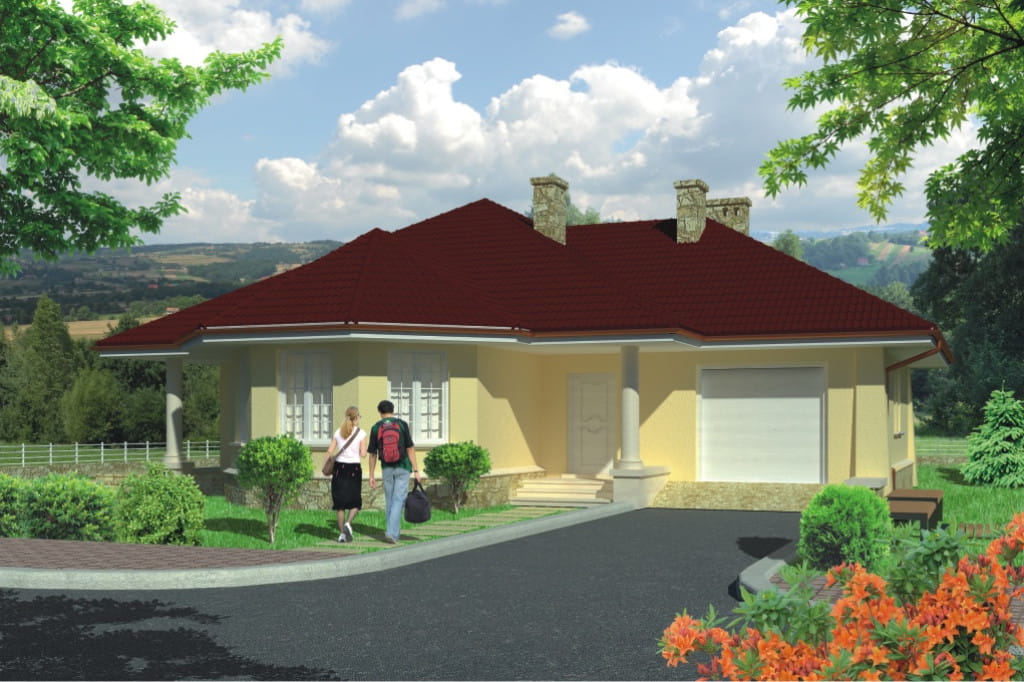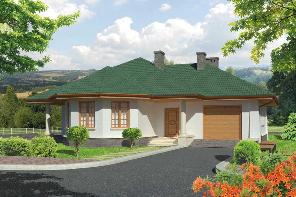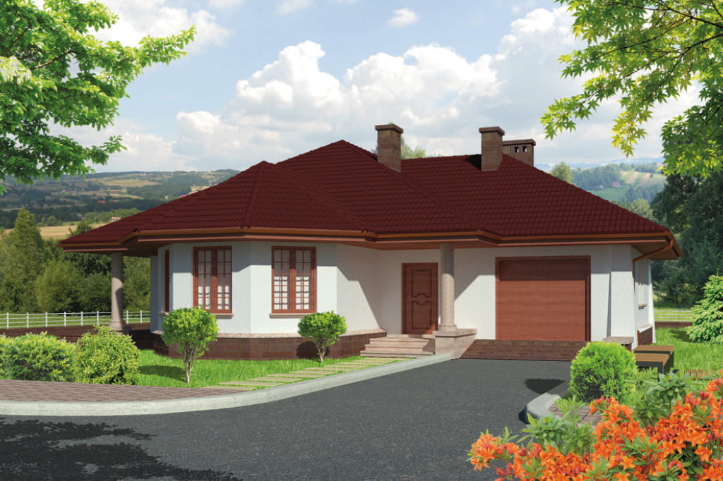 Rozbudowana bryła i wielospadowy dach nadają budynkowi eleganckiego i reprezentacyjnego wyglądu. Ogromną zaletą jest obecność garażu w bryle. Dostępny jest on z wnętrza budynku, co znacznie zwiększa komfort użytkowania.