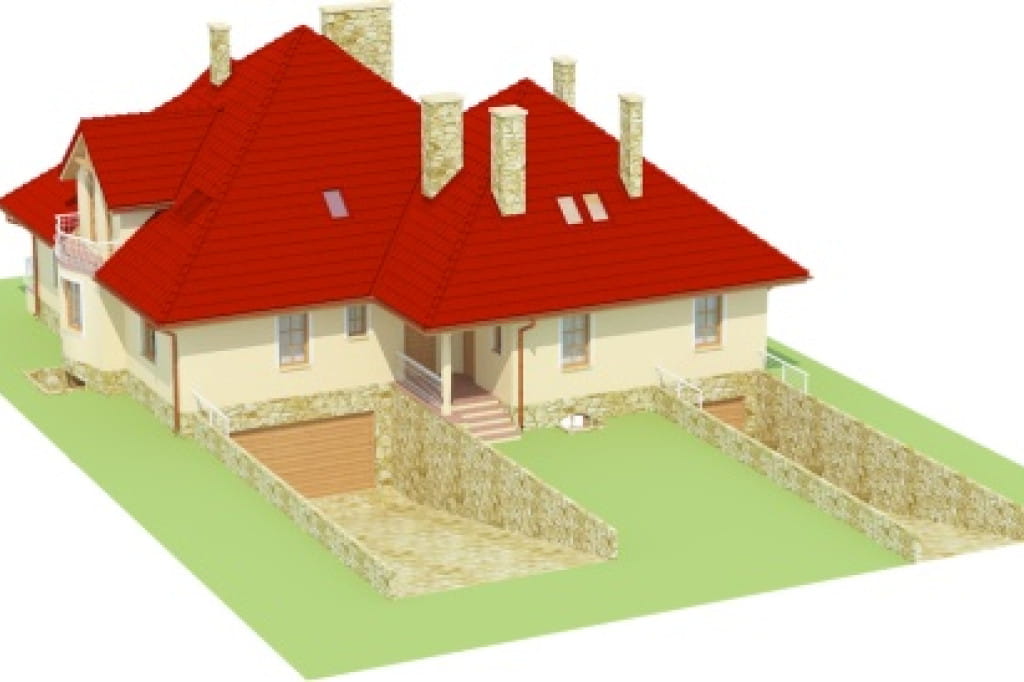 Projekt domu DM-6440. Dom dwu segmentowy dwurodzinny, parterowy z 2 garażami, z poddaszem mieszkalnym, częściowo podpiwniczony. Technologia tradycyjna. Ściany zewnętrzne: pustak POROTHERM 25 cm, styropian 15 cm, tynk zewnętrzny. Stropy w budynku: żelbetowe. Kąt nachylenia dachu 40°. Program segment 1: 3 pokoje, salon, kuchnia, jadalnia, gabinet, 3 łazienki, kotłownia, garaż dwustanowiskowy. Segment 2: 2 pokoje, kuchnia z jadalnią, 2 łazienki, WC, garaż.