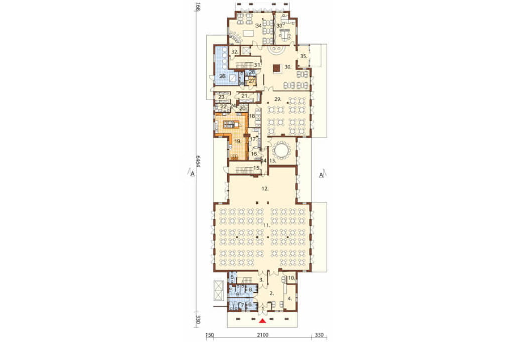Na parterze budynku wydzielono dwie strefy - jedną otwartą, przeznaczoną na dużą salę taneczną lub restauracyjną, drugą zaś na mniejsze pomieszczenia o różnych funkcjach. Parter idealnie nadaje się na organizację bankietów, przyjęć, wesel lub konferencji. Zaplecze np. kuchnia, magazyny, pomieszczenia socjalne, węzły sanitarne zorganizowano w sposób niezwykle przemyślany, co z pewnością ułatwi pracę.