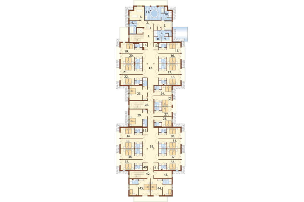 Na piętrze zorganizowano typową strefę mieszkalną. Zaplanowano tu aż dwadzieścia cztery podwójne pokoje z prywatnymi łazienkami i wyjściami na niewielkie balkoniki. Dodatkowo umieszczono tu strefę rekreacyjną tj. sauny, jacuzzi i gabinet SPA.