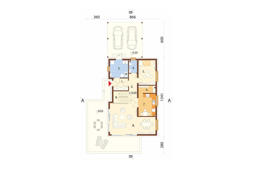 Program: wiatrołap, przedpokój, pomieszczenie gospodarcze, kuchnia, spiżarnia, salon z jadalnią, 4 pokoje, 3 łazienki, garderoba, komunikacja