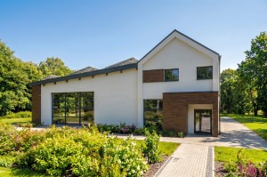 część mieszkalna - klatka schodowa, hol wejściowy, WC, kuchnia, spiżarnia, jadalnia, pokój dzienny, korytarz oraz trzy pokoje – każdy z własną łazienką.