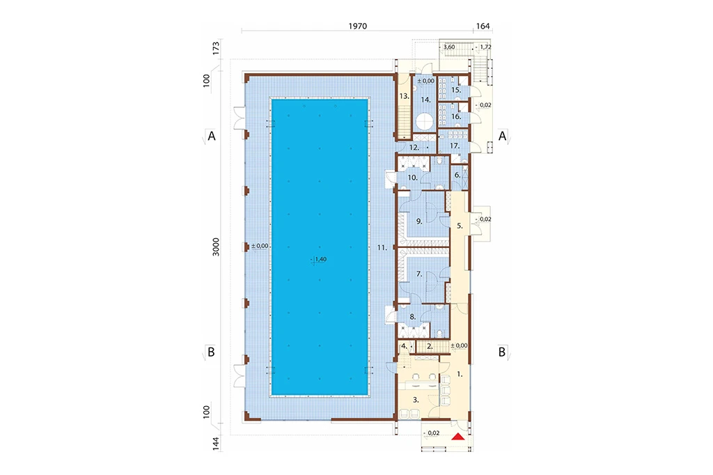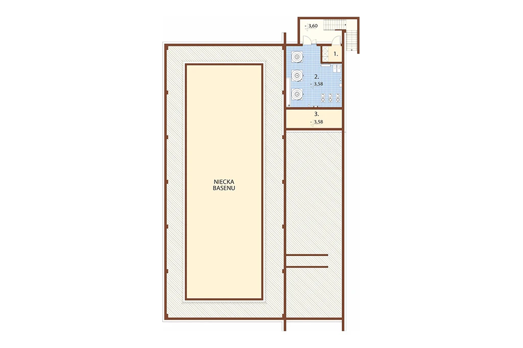 Piwnica: pomieszczenie techniczne elektryczne, pomieszczenie techniczne basenu, zbiornik wyrównawczy.