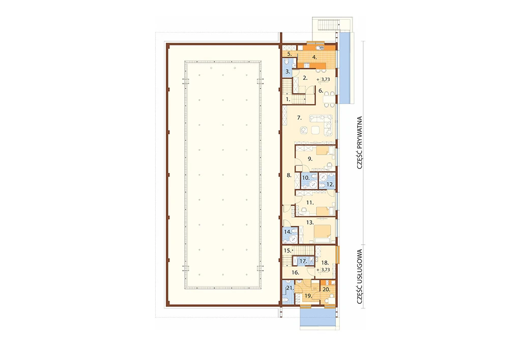część usługowa - klatka schodowa, korytarz, pomieszczenie porządkowe, pomieszczenie gospodarcze, szatnia personelu, pokój śniadań oraz WC.