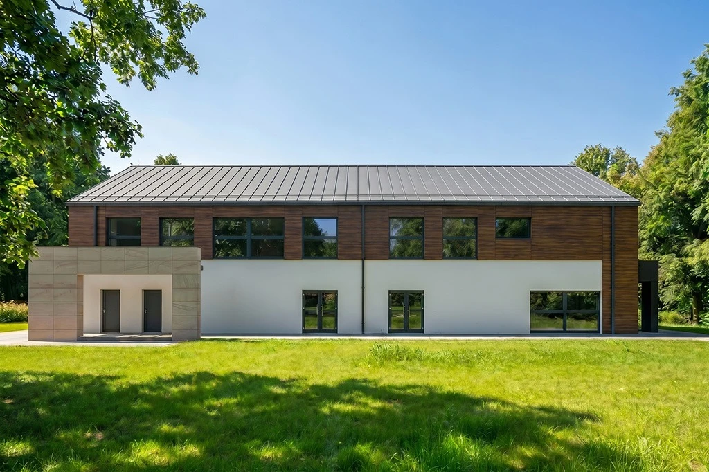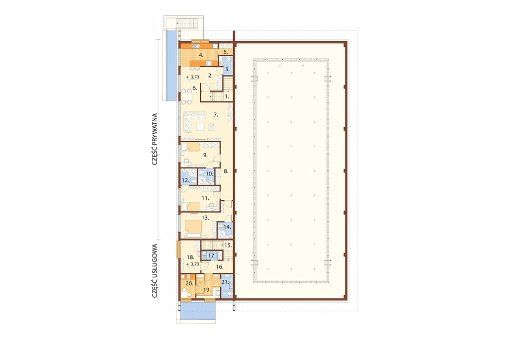 Powierzchnia użytkowa: 614,91 m2. Obiekt częściowo podpiwniczony, z dwiema kondygnacjami nadziemnymi: parterem oraz piętrem. W części usługowej zaprojektowano basen, szatnie, sanitariaty oraz pomieszczenia techniczne. W części mieszkalnej przewidziano pełne mieszkanie z kuchnią, jadalnią, pokojem dziennym oraz trzema sypialniami z łazienkami. Obiekt w części usługowej jest przystosowany dla osób niepełnosprawnych