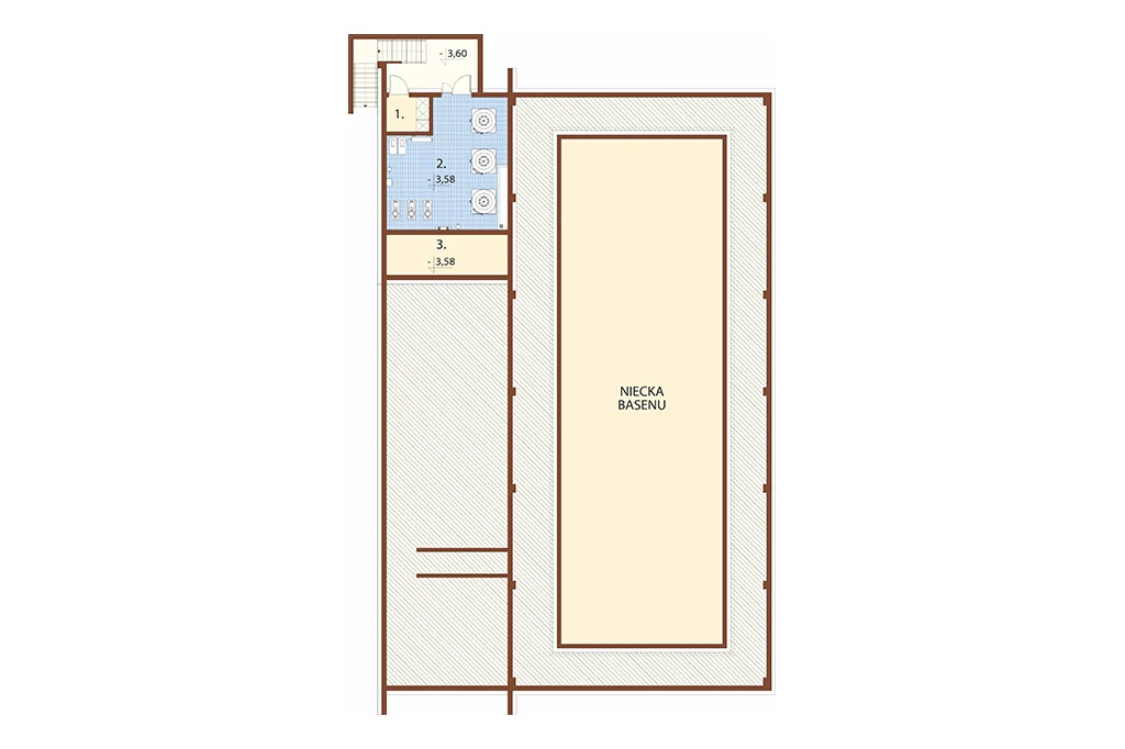 część usługowa - hol wejściowy, klatka schodowa, recepcja, składzik, korytarz, WC ogólnodostępne, szatnia i przebieralnia męska, WC i prysznice męskie, szatnia i przebieralnia damska, WC i prysznice damskie, basen, składzik sprzętu basenowego, pomieszczenie techniczne – kotłownia, magazyn korektora pH, magazyn koagulanta oraz magazyn podchlorynu sodu.