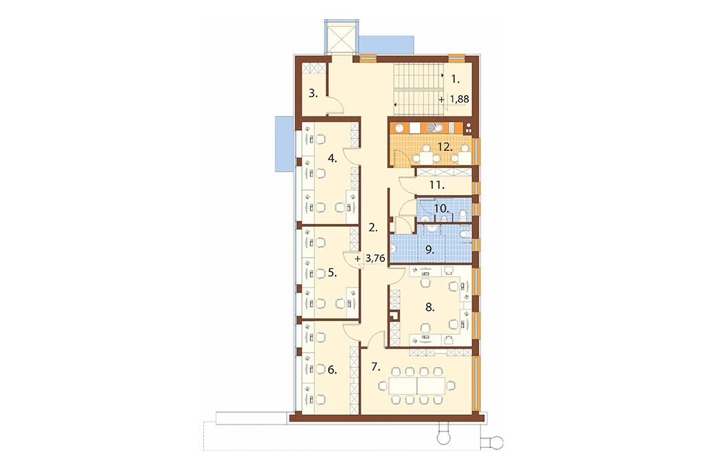 I piętro: korytarz, archiwum, cztery pomieszczenia biurowe, sala konferencyjna, WC damskie / dla osób niepełnosprawnych, WC męskie, pomieszczenie socjalne, szatnia podręczna oraz komunikacja.