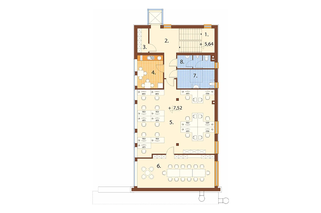 Parter: hol, korytarz, wiatrołap, archiwum, sala sprzedaży, trzy pomieszczenia biurowe, sala konferencyjna, pomieszczenie socjalne, WC damskie / dla osób niepełnosprawnych, WC męskie, szatnia podręczna, kotłownia oraz komunikacja.