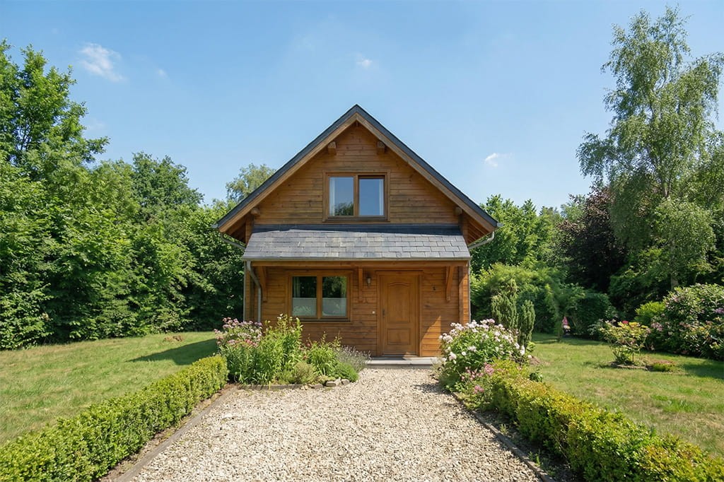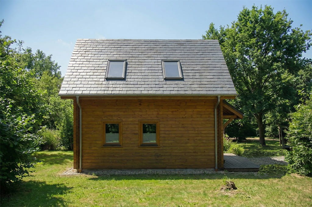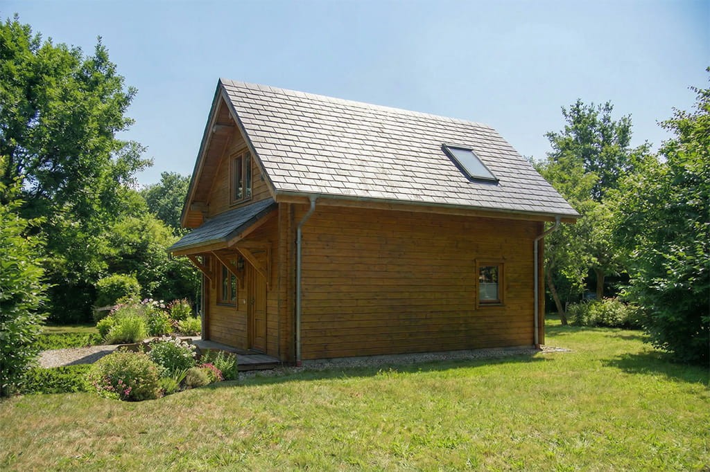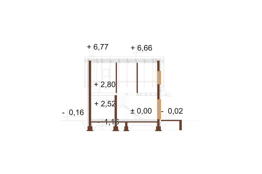 Ściany zewnętrzne: tynk systemowy cienkowarstwowy na siatce / okładzina elewacyjna imitująca deski, wełna mineralna 15 cm, folia wiatroizolacyjna paroprzepuszczalna, płyty MDF 2,2 cm, wełna mineralna 16 cm pomiędzy słupkami konstrukcji, konstrukcja drewniana – słupki 4×16 cm, folia paroizolacyjna PCV, ruszt 5 cm z wypełnieniem wełną mineralną, płyta GKF 1,25 cm