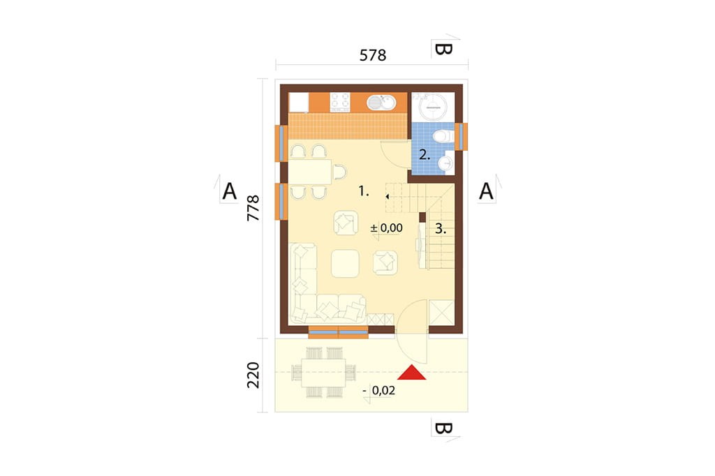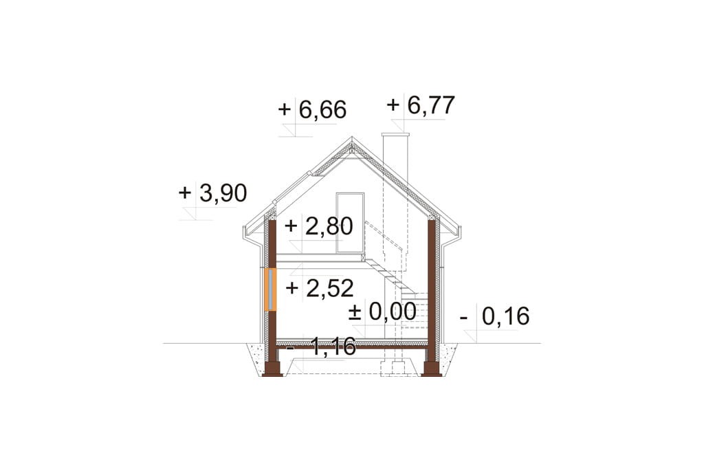 Powierzchnia użytkowa: 53,89 m2. Budynek mieszkalny jednorodzinny, parterowy z użytkowym poddaszem, niepodpiwniczony. Zaprojektowany w technologii szkieletu drewnianego, z dachem dwuspadowym o kącie nachylenia 40°.