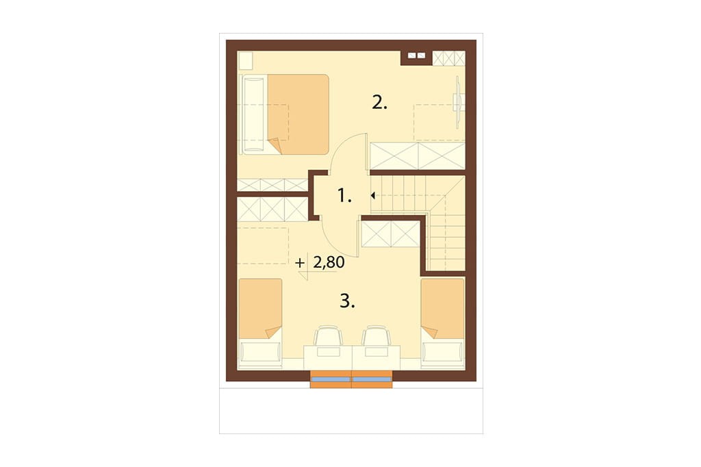 Program: pokój dzienny z jadalnią i kuchnią, łazienka, dwa pokoje, przedpokój, schody